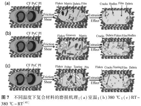 不同温度下,复合材料的磨损机理同样不同。以热解碳改性碳纤维立体织物增强聚酰亚胺复合材料(PI-C/CF)为例,三种温度下该复合材料的磨损过程如图7所示。室温下,复合材料在磨损过程中增强相和基体产生磨屑并不断剥落,形成润滑膜,并在磨损过程中不断扩大。因此,室温下的磨损机理主要包括连锁效应、黏着和磨粒磨损;在380℃时,基体和增强相因摩擦和剪切而断裂,跑合磨损完成后,磨屑产生形变并粘附在复合材料表面,形成自润滑膜;同时,树脂基体在高温下会发生热解并被不断氧化,使复合材料表面出现微孔和微裂纹。因此,此时的磨损机理可断定为黏着磨损、磨粒磨损和氧化磨损;在RT~380℃~RT环境下,复合材料的磨损机理与380℃时类似,但由于周期性环境变化的影响,摩擦表面的润滑膜会不断被撕裂并从复合材料表面剥落,故可认为交变温度下的磨损机理为黏着磨损和氧化磨损。