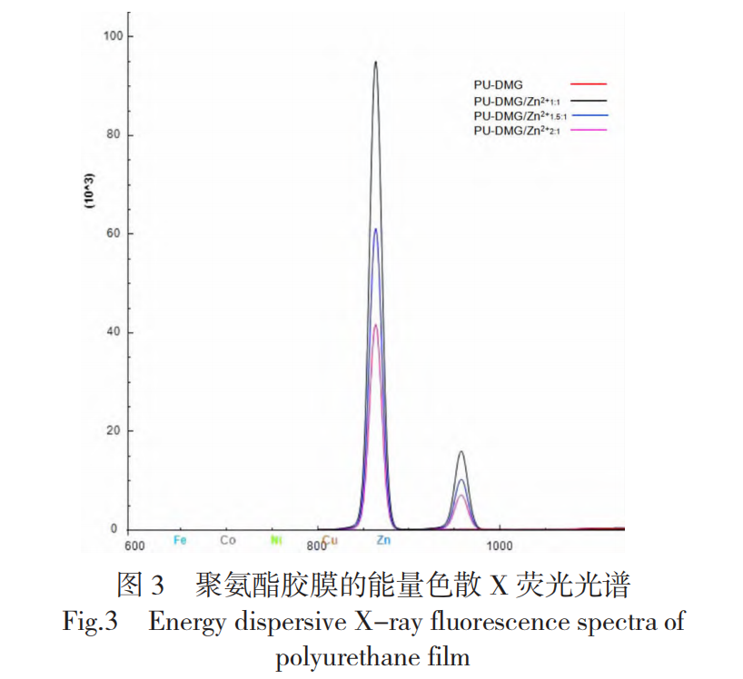 能量色散 X 荧光光谱仪是通过测量样品吸收入射 X 射线后产生的荧光辐射来确定样品中各种元素的含量,而每个峰值对应于一个元素[16] 。由图 3 可见,PU-DMG/Zn2+ 胶膜在波长 860 nm 和 960 nm 附近出现含 Zn 的峰,其中 860 nm 峰的强度要大于 960 nm 峰的强度,其中含 Zn 量越大,峰的强度越大。PU-DMG 胶膜因没有外加 ZnCl2,检出量只有 0.26 ppm,在能量色散 X 荧光光谱中没有展现出来。 Zn 元素在 960 nm 出现的峰,有可能是能量色散 X 射线荧光光谱中包含 Zn 元素的 K 系、L 系、M 系特征谱线和逃逸峰等等。