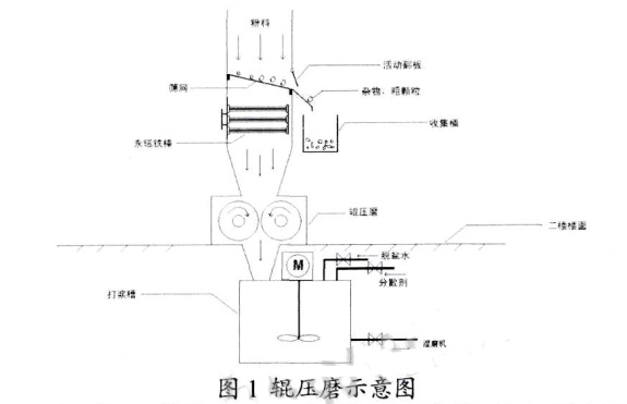 我公司根据生产需要,采用辊压磨和球磨机配合使用的方式,将落窑品研磨分散,在实际生产中取得了较好的效果。粗品经过辊压磨碾压之后,经过辊压磨打浆槽,在搅拌的作用下加入脱盐水和分散剂制成浆料,浆料经球磨机研磨后转入浆料储槽,供砂磨岗位使用。在这个岗位关键是要控制浆料的筛余,如果筛余过大,将增加砂磨机的压力,不利于后续的研磨分散。