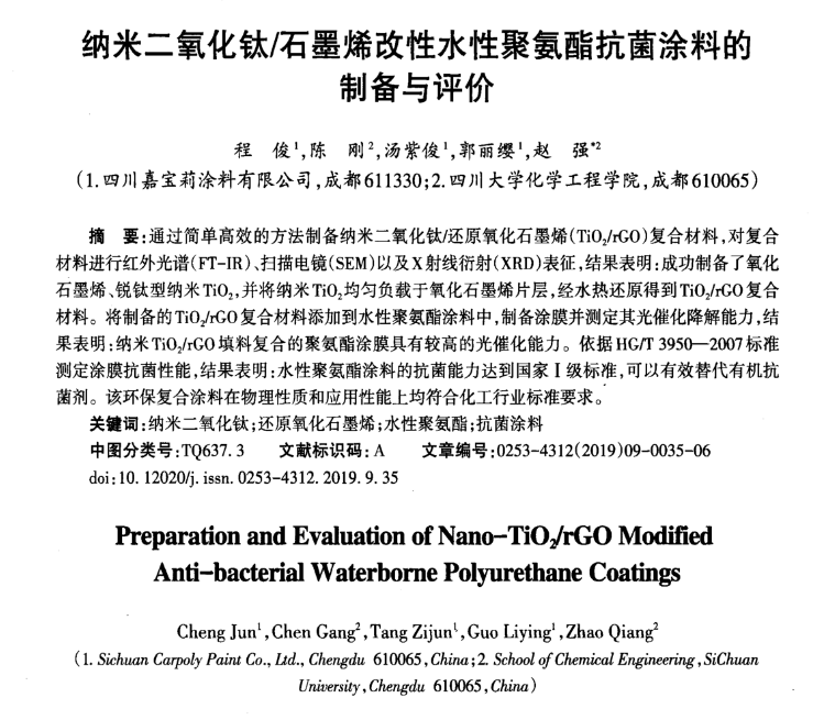 关键词:纳米二氧化钛,还原氧化石墨烯,水性聚氨酯,抗菌涂料