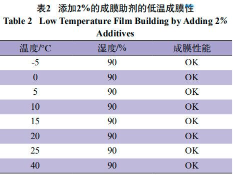 由于户外乳液通常最低成膜温度MFFT较低,所以具有极低的成膜溶剂需求。经过测试基础清漆配方中添加2%的成膜助剂的低温成膜性无异常,见表2。