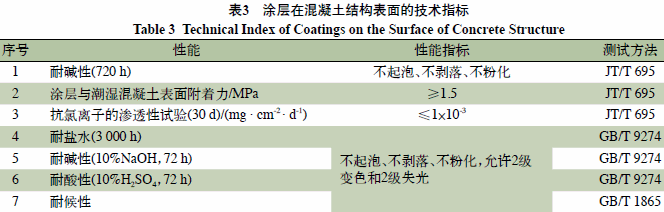 湿固化涂层在桥梁上应用有着明确的技术指标要求,表3摘录自JT/T 695—2007《混凝土桥梁结构表面涂层防腐技术条件》,列明了配套涂层在混凝土结构表面所需要满足的技术指标。同时对湿固化涂料的机械性能等进行了测试,见表4。