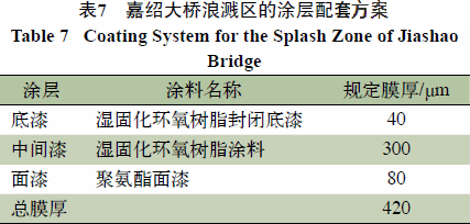 嘉绍大桥地处钱塘江尖山河段的江海交汇处,因潮强流急、潮位涨退频繁、含沙量大等原因,防腐环境复杂,施工条件极其特殊,对配套涂料提出了很高要求。尤其是浪溅区的要求更为苛刻,针对环境和保护年限,特设计如表7配套方案。