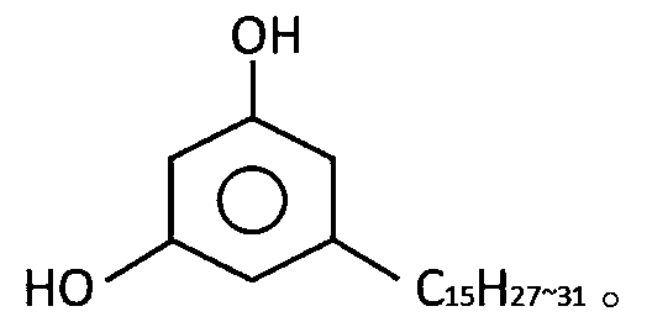 强心酚是一种从天然腰果壳油中经提炼而成的油状液体,其与腰果酚相比酚羟基间位上还有一个酚羟基,除了有腰果酚同样的性能(含苯环结构,具有耐高温性能;极性的羟基可提供体系对接触面的润湿和活性;间位含不饱和双键的碳15直链,能提供体系良好的韧性,优异的憎水性和低渗透性和自干性)外,两个酚羟基带来的活性比腰果酚更高,能提供更好的反应性及改性基础。