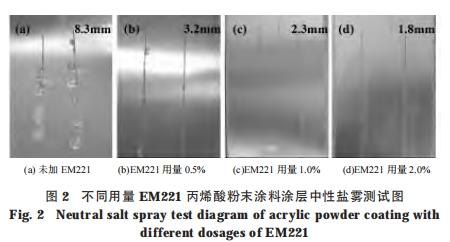 从表7和图2可知,随着EM221用量增加,丙烯酸树脂的粘度和玻璃化转变温度相应提高,固化后的丙烯酸粉末涂层具有优异的储存稳定性、机械性能、耐丁酮擦拭和耐腐蚀性,这是因为EM221用量的增加,提高了丙烯酸树脂的交联密度,涂层表现出较好的冲击性能,涂层交联密度增加也能提升丙烯酸树脂的玻璃化转变温度,其粉末涂料表现出较好的储存稳定性,同时高交联密度的涂层能够有效阻碍溶剂的渗透,因此涂层表现出较好的耐丁酮擦拭和耐盐雾腐蚀性;当EM221用量增加至2.0%时,合成的丙烯酸树脂具有较高的粘度,制备的粉末涂层有轻微橘皮现象。因此,当EM221用量为1.0%时较为合适。