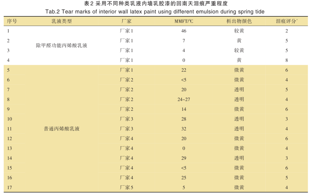 乳液是乳胶漆里最重要的成分,所以首先探索采用不同厂家、不同型号乳液的内墙乳胶漆回南天泪痕的严重程度,根据测试结果对泪痕析出程度进行评分,同时也记录泪痕析出物的颜色,见表 2。由于乳液的性能和其最低成膜温度(MMFT)息息相关,所以将其与泪痕严重程度进行了相关性分析。此外,有些内墙乳胶漆乳液会通过引入特殊功能基团使其具有去除甲醛功能,因此对此类乳液进行了单独分组考察。由表 2 可知,相比于普通丙烯酸乳液析出物为透明或微色,除甲醛功能丙烯酸乳液析出物均为黄色油状物,且 MMFT 越低泪痕越严重。然而,对于普通丙烯酸乳液,泪痕严重程度与 MMFT 相关性不大,主要决定因素可能在于乳液合成过程中所用乳化剂的种类和含量。