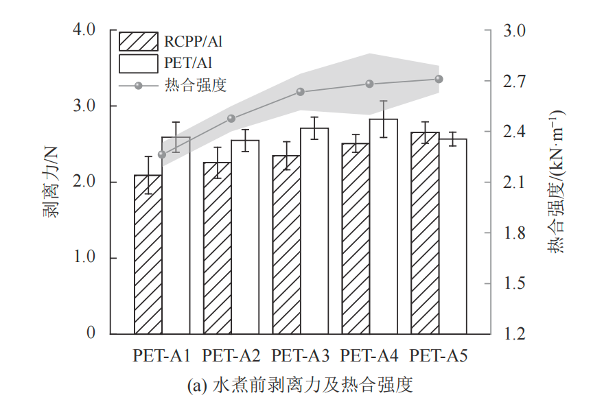 图6为不同PET-A制备的聚氨酯胶黏剂水煮前后各层剥离力和热合强度测试结果。如图6所示,随聚酯分子量减小,RCPP/Al层剥离力和热合强度逐渐增大。随PET-A分子量减小,胶黏剂硬段质量分数由27.5%增加至30.3%,胶黏剂分子链中氨基甲酸酯和脲键数量增加使得胶黏剂与基材的氢键作用增加,因此剥离力增加,胶黏剂内聚力增大[15] 。对于较厚的基材,复合膜剥离力增大,其热合强度也得到提高[16] 。PET/Al层剥离力变化较小。经水煮后,随PET-A分子量减小,复合膜各层剥离力增加,这可能是由于疏水基团氨基甲酸酯增加,胶黏剂与基材氢键作用增大,阻碍了水分子的侵蚀。