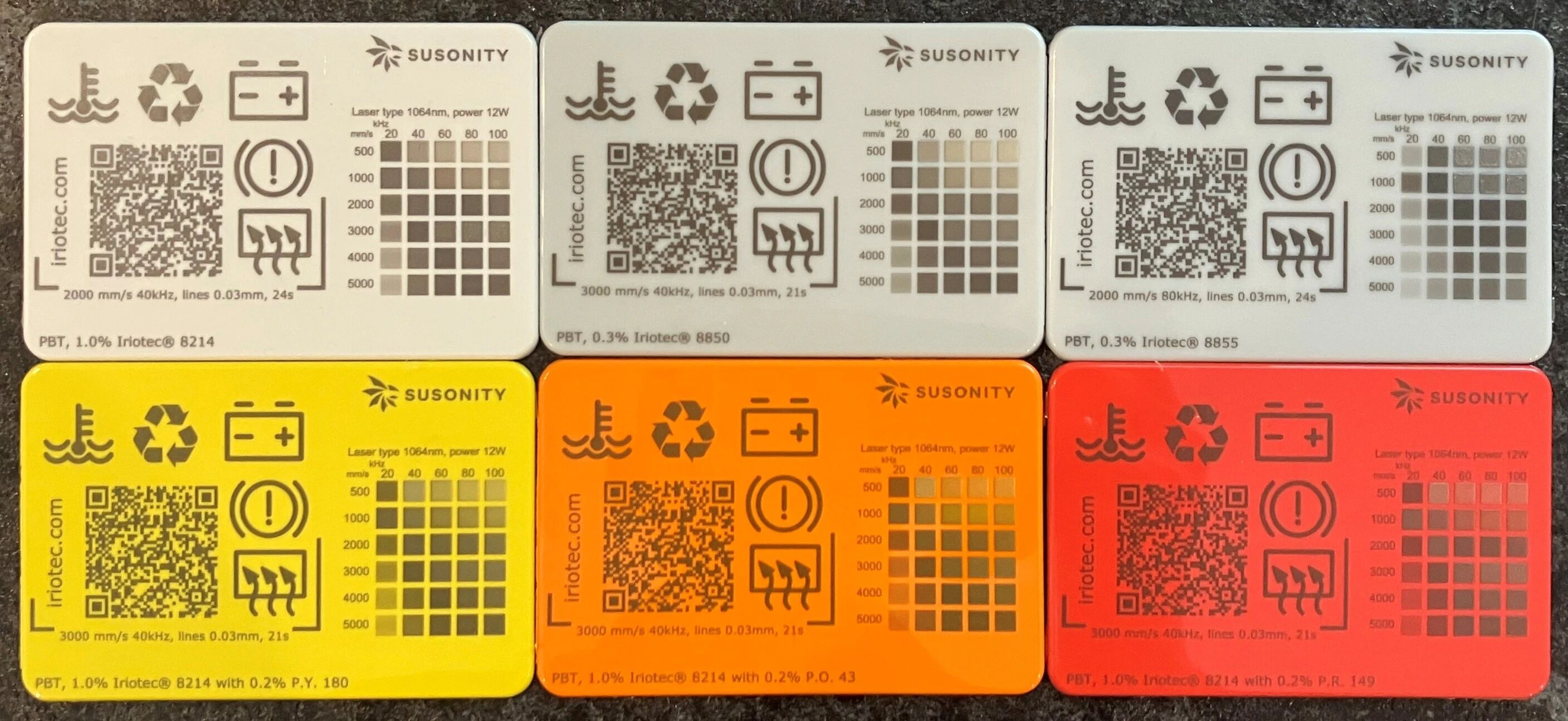 在为阻燃PBT激光标识发灰、发虚、效率低而头痛?斓世新型激光标识助剂——Iriotec® 8214正式登陆中国!1%添加量,即可在彩色和白色的阻燃PBT及其合金体系(如PC/PBT和PBT/ASA)中呈现高对比度深色标识。