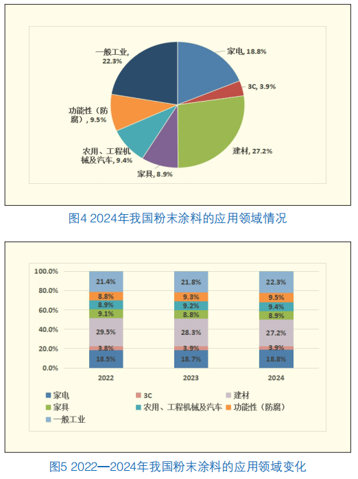 数据统计显示,在热固性粉末涂料领域,2024年建材(含暖通)粉末涂料市场份额为27.2%;一般工业用粉末涂料市场份额占22.3%;家电粉末涂料市场份额占18.8%;家具粉末8.9%;其他应用领域包括功能性(防腐)9.5%、农用工程机械及汽车9.4%、3C产品3.9%。2024年我国粉末涂料应用领域情况见图4,各领域整体走势见图5,基本与我国下游行业的运行情况及重点领域“漆改粉”趋势相一致。