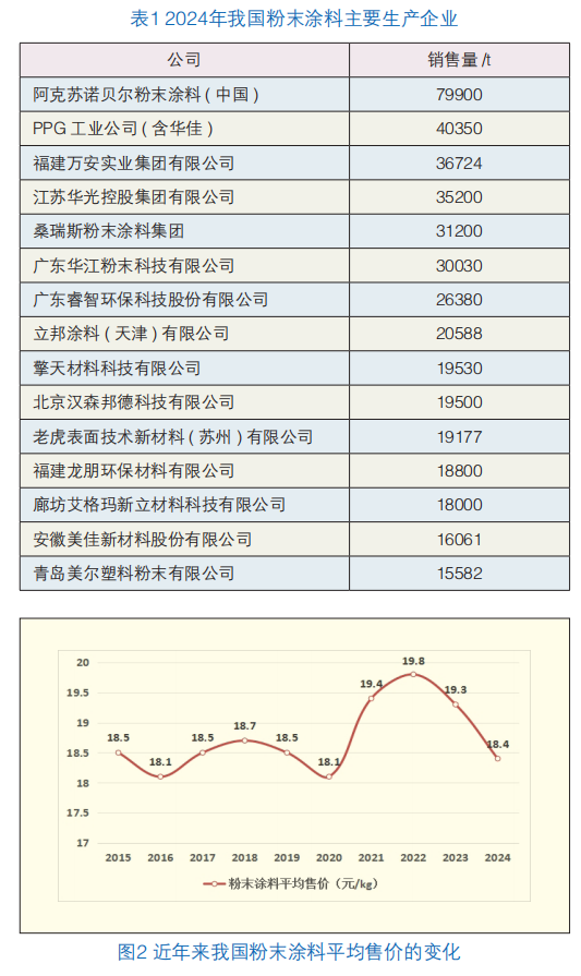 据中国化工学会涂料涂装专业委员会和全国涂料工业信息中心统计,2024年我国热固性粉末涂料销量265万t左右,比上年度增长6.6%(见图1)。综合来看,多数粉末涂料企业在2024年实现了净利润的提升,主要归因于原材料价格回落带来的成本压力缓解,整体毛利率水平有所改善。此外,部分企业还受益于销售收入的增长以及有效的成本管控措施,带动行业整体利润逐步修复。总体来看,粉末涂料行业仍处于成长期,但粗放式增长阶段已基本结束。
