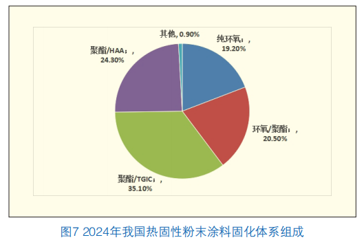 统计显示,2024年我国热固性粉末涂料中,纯环氧粉末涂料占比19.2%,环氧/聚酯混合型粉末涂料20.5%,聚酯/TGIC型粉末涂料35.1%,聚酯/HAA型粉末涂料24.3%,其他类型粉末涂料占0.9%。总体来看,各体系之间占比切换主要受成本影响,纯聚酯体系粉末产品对其他常规体系替代进一步加大(图7)。2024年混合体系受TMA价格暴涨影响比较大。