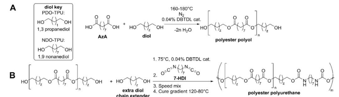 方案1. (A) AzA- PDO 和AzA- NDO 聚酯多元醇 (B) AzA- PDO -7HDI和AzANDO-7HDI TPU的合成反应方案