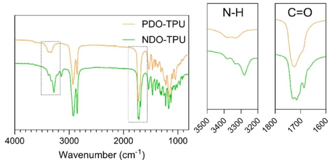 图1. NDO - TPU 和 PDO - TPU 的傅里叶变换红外光谱(FT-IR)分析。