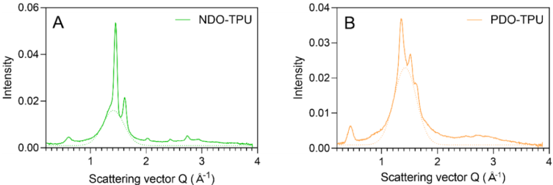 图3. NDO - TPU (A) 和 PDO - TPU (B) 的广角X射线散射(WAXS)分析。