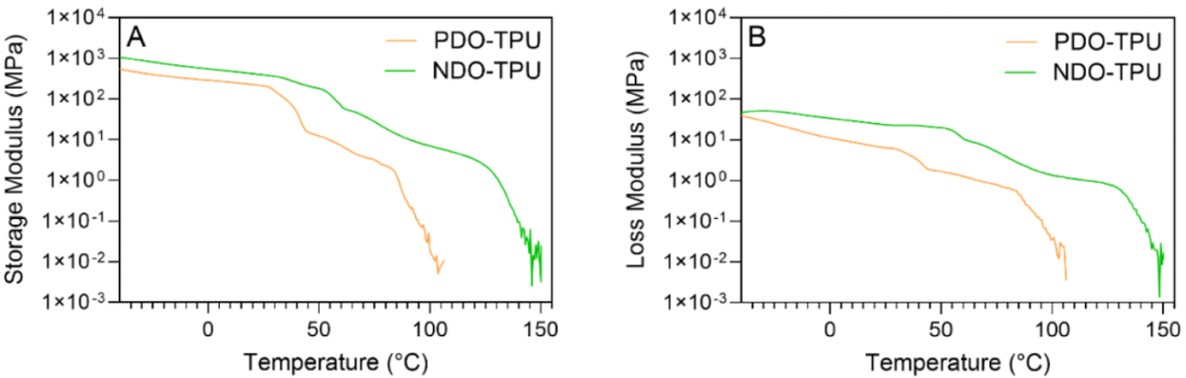 图4. TPU的动态力学分析(DMA)。在施加振荡拉伸力的温度扫描过程中,对(A)储能模量和(B)损耗模量进行了分析。
