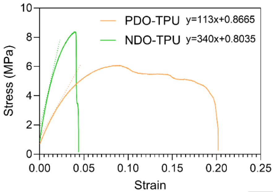 图5. TPU的应力-应变曲线。虚线表示线性弹性区域的切线。
