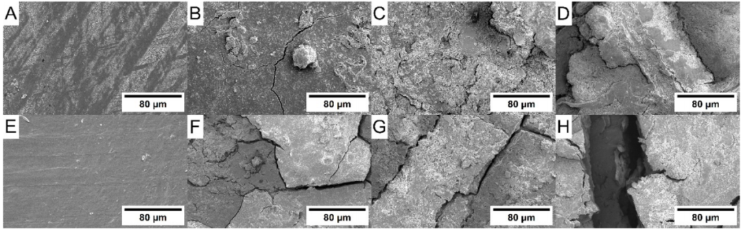 图6. 扫描电子显微镜(SEM)图像显示 NDO - TPU(A-D)和 PDO - TPU(E-H)。样品在堆肥中孵育前(A和E)以及4周后(B和F)、8周后(C和G)、14周后(D和H)采集用于成像。显示的图像是2000倍放大,使用50/50混合BSD和SED探测器采集。