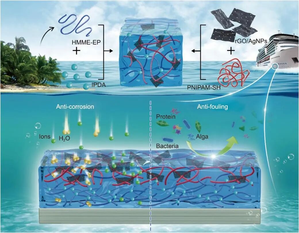 研究团队在生物基有机硅–环氧树脂体系中引入了还原氧化石墨烯(rGO)/银纳米颗粒(AgNPs)与亲水性高分子材料,构建出具有互穿网络(IPN)结构的涂层。有机硅–环氧树脂、rGO/AgNPs及亲水高分子三者协同,通过释污作用、接触抑制效应和水合屏障三重机制赋予涂层优异的防污性能。同时,该涂层还通过致密结构、屏障效应与钝化作用构成三元协同防腐机制,展现出卓越的防腐性能。此外,当涂层受损时,其内部的动态次级网络能够实现缺陷的自修复,从而防止结构快速失效。