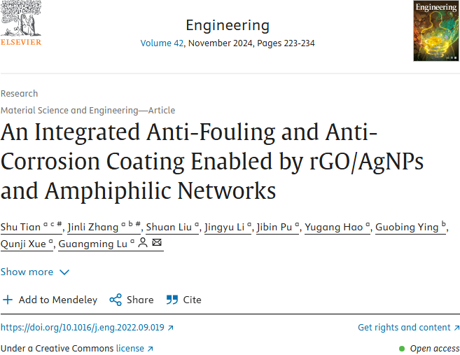 Shu Tian,Jinli Zhang,Shuan Liu,Jingyu Li,Jibin Pu,Yugang Hao,Guobing Ying,Qunji Xue,Guangming Lu. An Integrated Anti-Fouling and Anti-Corrosion Coating Enabled by rGO/AgNPs and Amphiphilic Networks. Engineering, 2024, 42(11): 233-244 DOI:10.1016/j.eng.2022.09.019