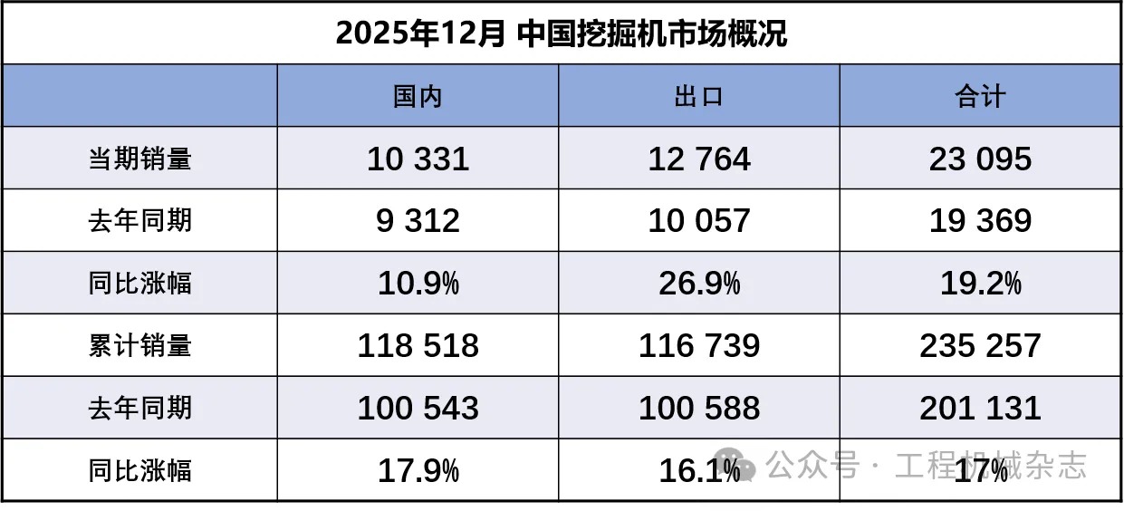 据中国工程机械工业协会对挖掘机主要制造企业统计,2025年12月销售各类挖掘机23095台,同比增长19.2%。其中国内销量10331台,同比增长10.9%;出口量12764台,同比增长26.9%。