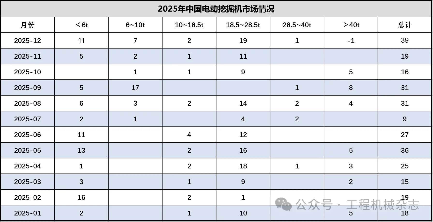2025年12月销售电动挖掘机39台(6吨级以下11台,6至10吨级7台,10至18.5吨级2台,18.5至28.5吨级19台,28.5至40吨级1台,40吨级及以上-1台)。