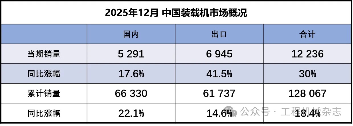 据中国工程机械工业协会对装载机主要制造企业统计,2025年12月销售各类装载机12236台,同比增长30%。其中国内销量5291台,同比增长17.6%;出口量6945台,同比增长41.5%。