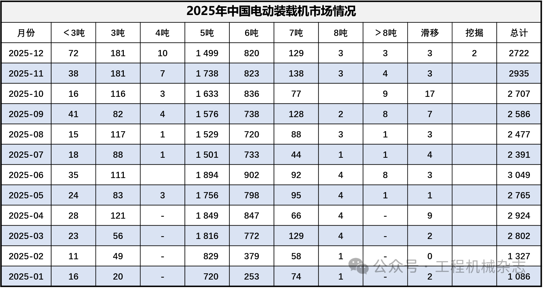2025年12月销售电动装载机2722台(3吨以下72台,3吨181台,4吨10台,5吨1499台,6吨820台,7吨129台,8吨3台,8吨以上3台,滑移装载机3台,挖掘装载机2台)。